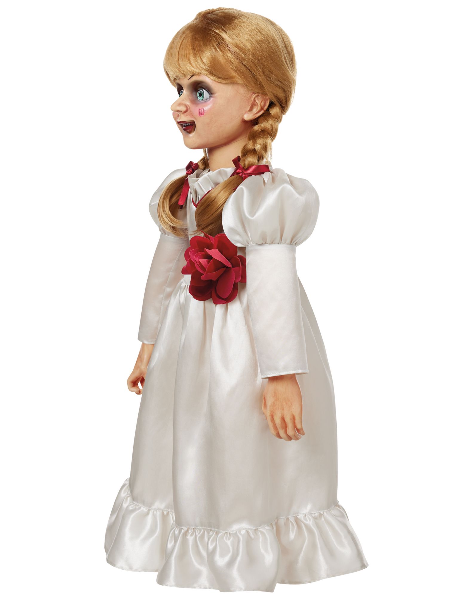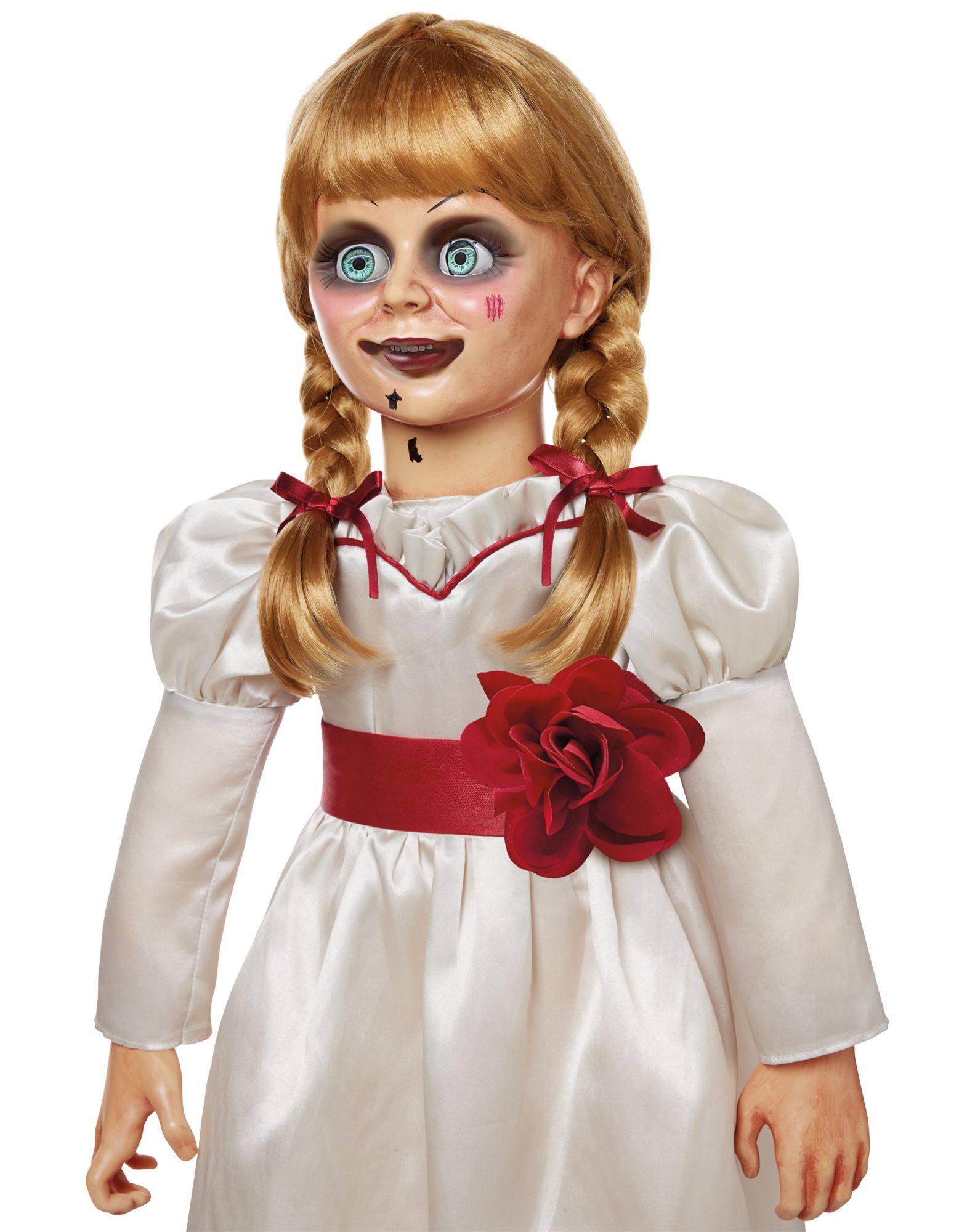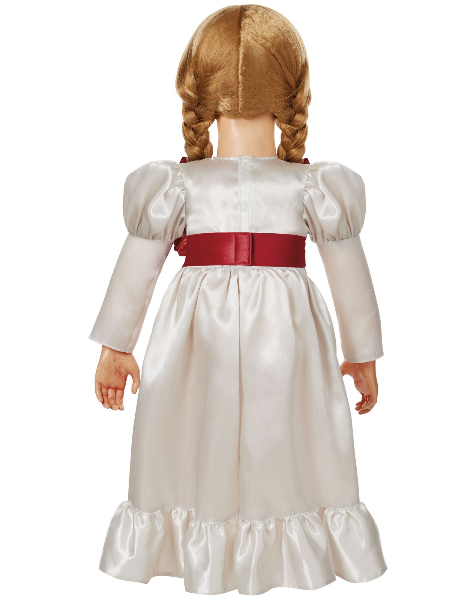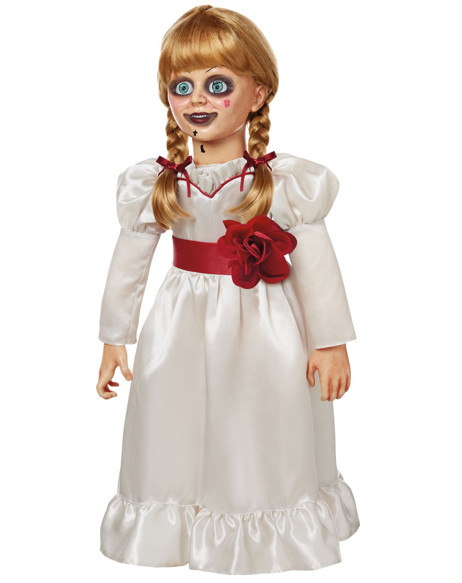 She wants your soul... Bring home your favorite horror character with this officially licensed, life-size Distressed Annabelle Doll. Standing 2.5 feet tall, this deadly doll features hyper-realistic facial detailing, her signature satin dress with red ribbon braids, and lifelike eyes that seem to follow you! Perfect for collectors and horror enthusiasts, this detailed replica is sure to scare your guests. Once you invite her in, there's no turning back!
