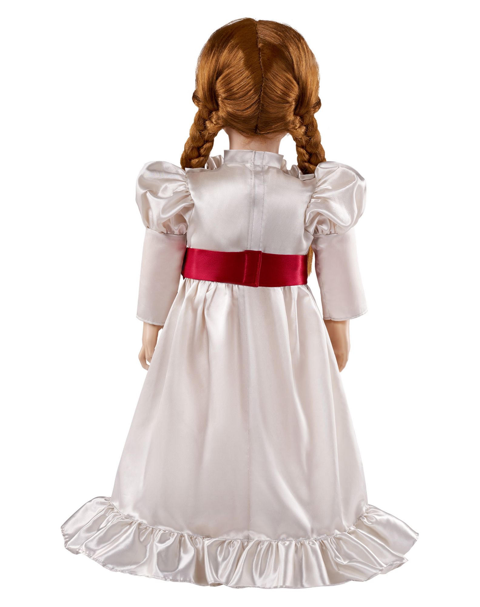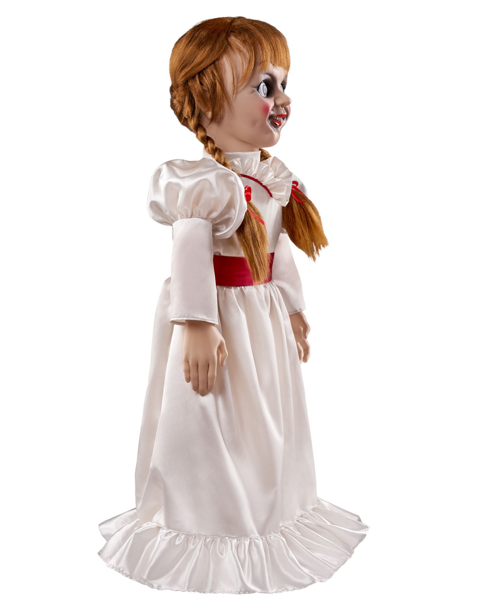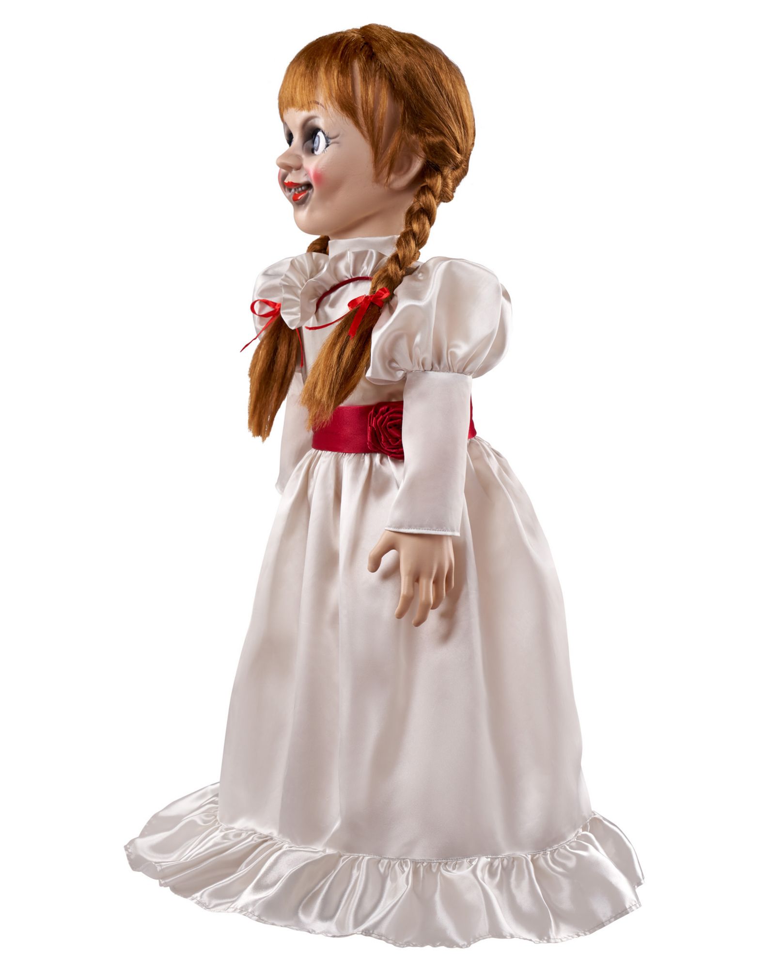 Bring your favorite horror movie character into your home with this Lifesize Annabelle Doll! Looking just like the terrifying doll from the film, this scary doll shows Annabelle in her familiar white dress with red trim, eyes round and wide, with a smile on her face and her hair in pigtails. Place your Annabelle doll in just the right location to give everyone who enters a fright!
