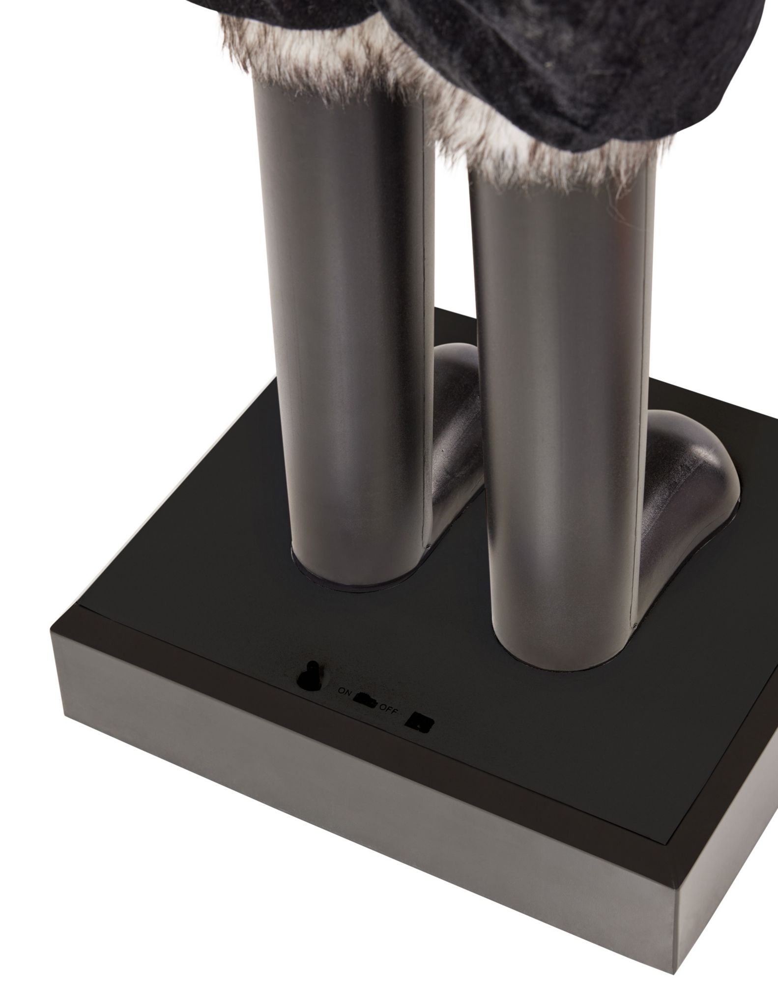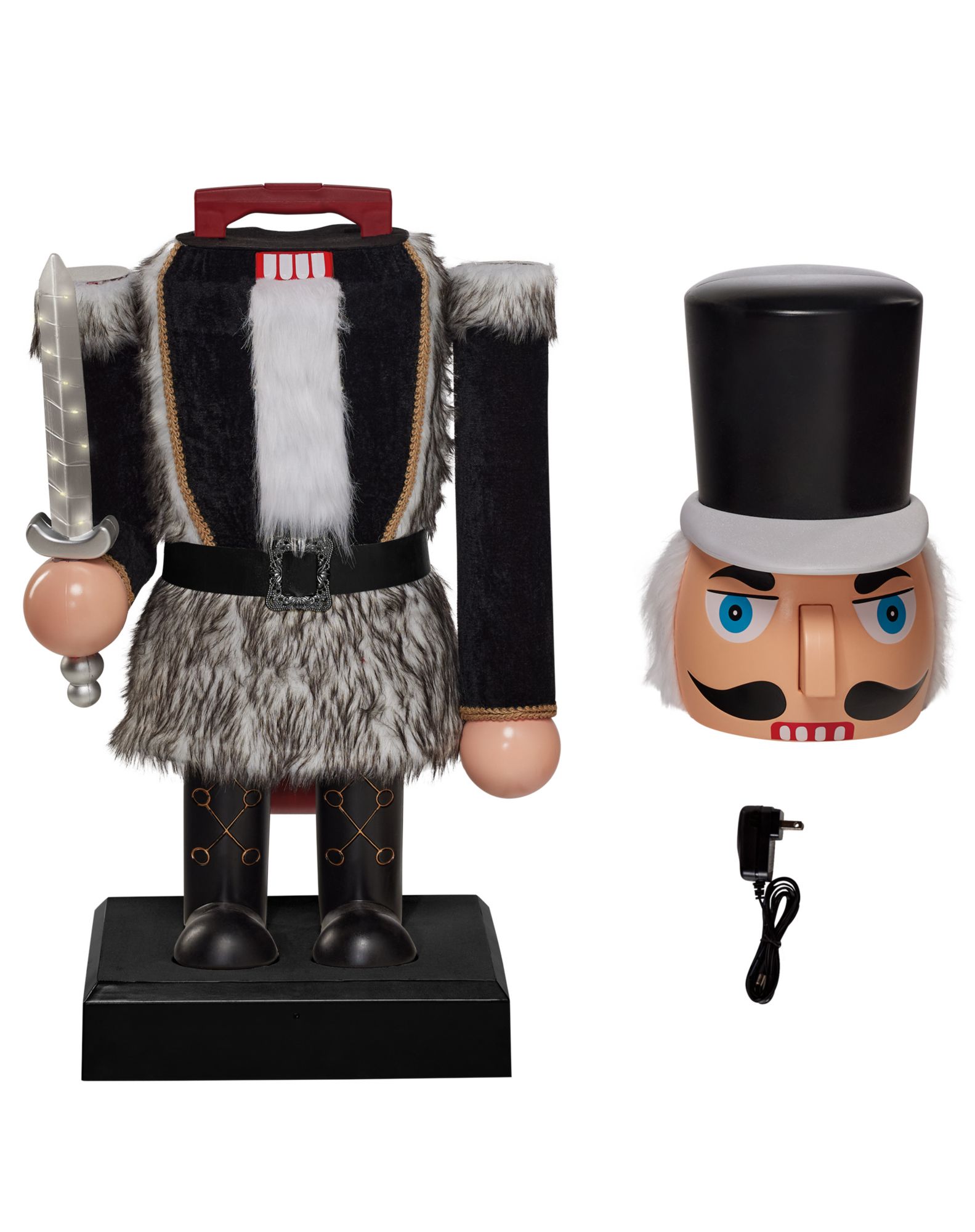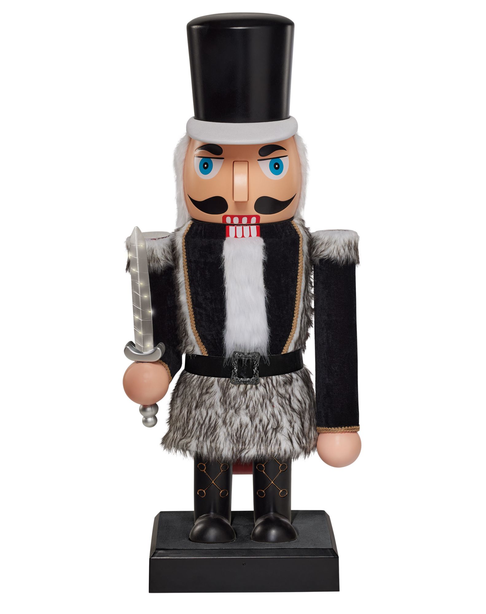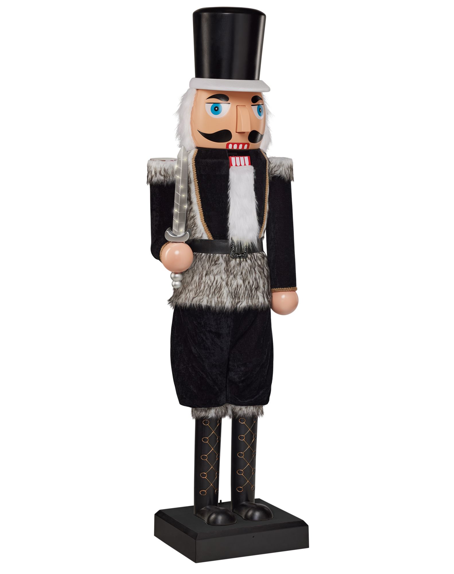 Son of a nutcracker! Spread Christmas cheer when you decorate with this Collapsible Black Soldier Animated Nutcracker. Standing 5 feet 2 inches tall, this holiday icon is dressed in a matte black suit with a fuzzy fur trim and carries a light-up sword prop. It's fully collapsible for easy setup, disassembly, and storage. Turn up the holiday cheer as it plays a rendition of “Jingle Bells,” while the mouth opens and closes. Whether placed by your tree, in an entryway, or as the centerpiece of your holiday party, this Soldier Nutcracker is sure to wow your guests!