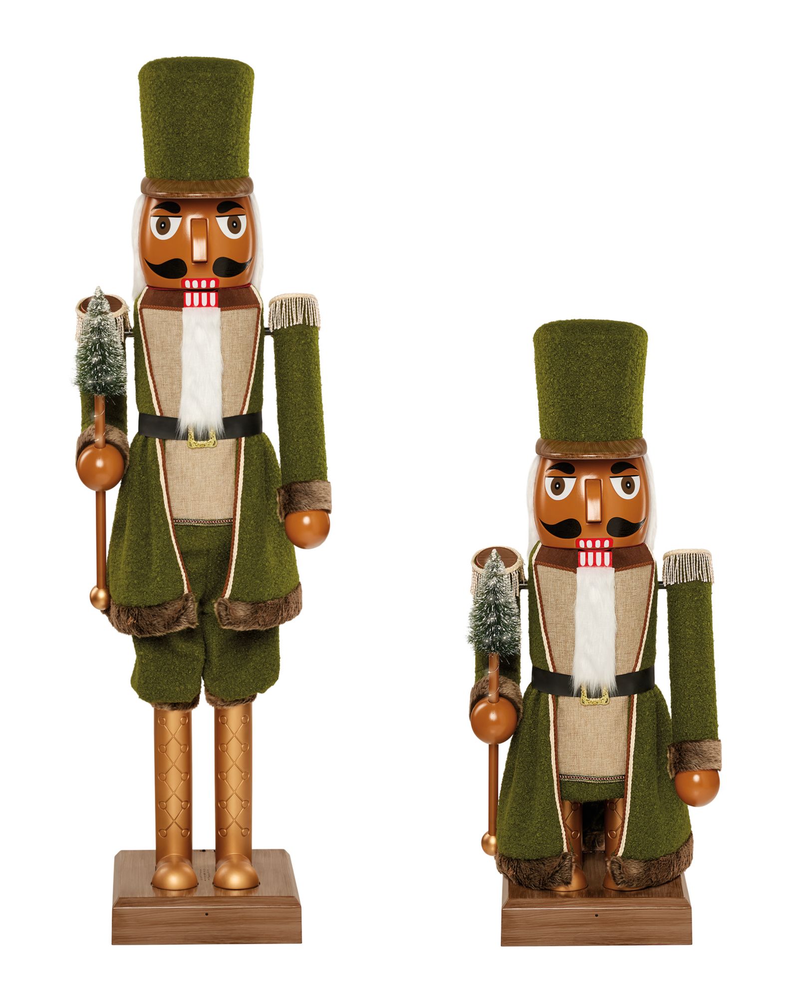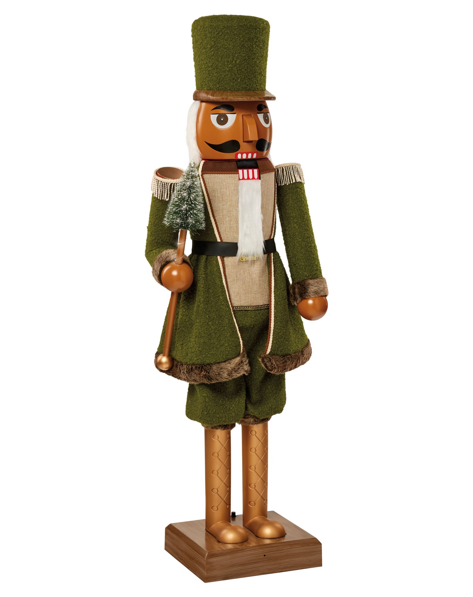 Bring the magic of the season home with this Collapsible Green Bouclé Animated Nutcracker! Standing 5 feet 2 inches tall, this holiday icon is dressed in a textured green suit with a fur trim and fringe lapels and carries a flocked Christmas tree wand. It's fully collapsible for easy setup, disassembly, and storage. Turn up the holiday cheer as it plays a rendition of “Jingle Bells,” while the mouth opens and closes. Whether placed by your tree, in an entryway, or as the centerpiece of your holiday party, this life-sized Nutcracker is sure to wow your guests!