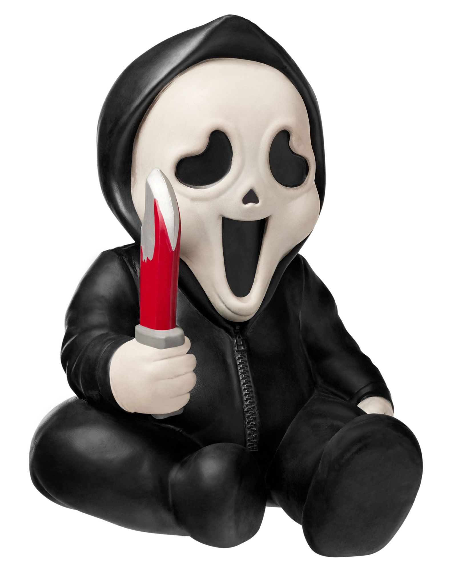 Get your home looking Halloween ready with this officially licensed Ghost Face Horror Baby. Any fan of the iconic slasher Ghost Face will love adding this adorable Ghost Face baby to their horror collection. This officially licensed doll is equipped with a fake bloody knife and is so cute he's to die for.