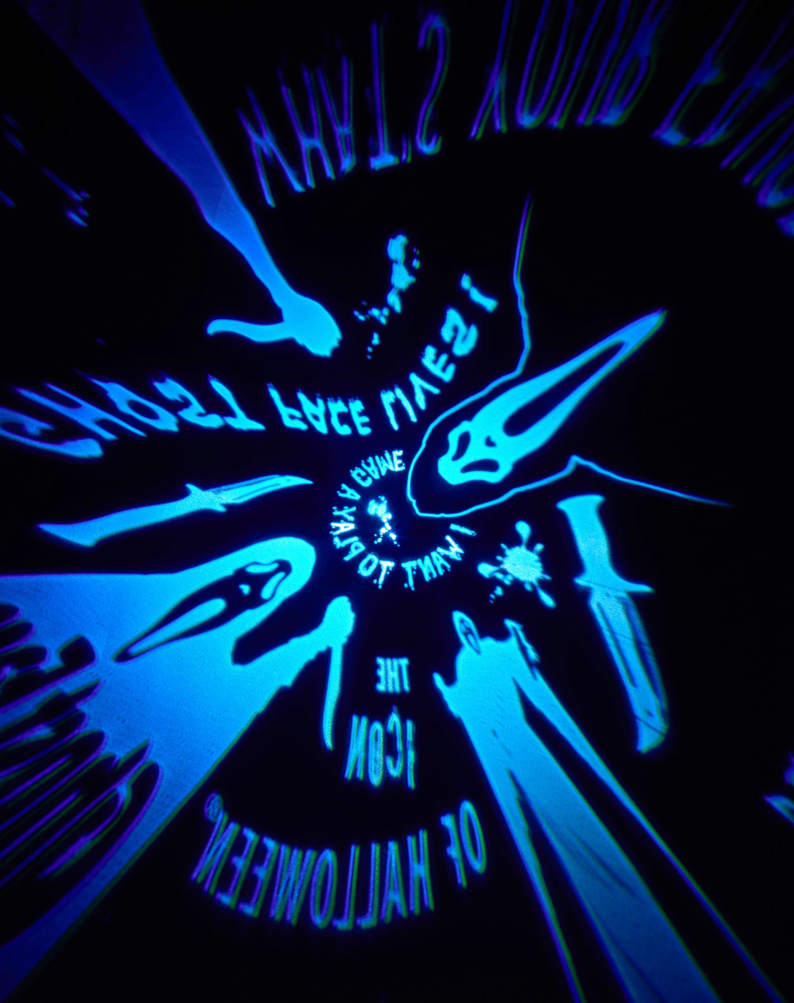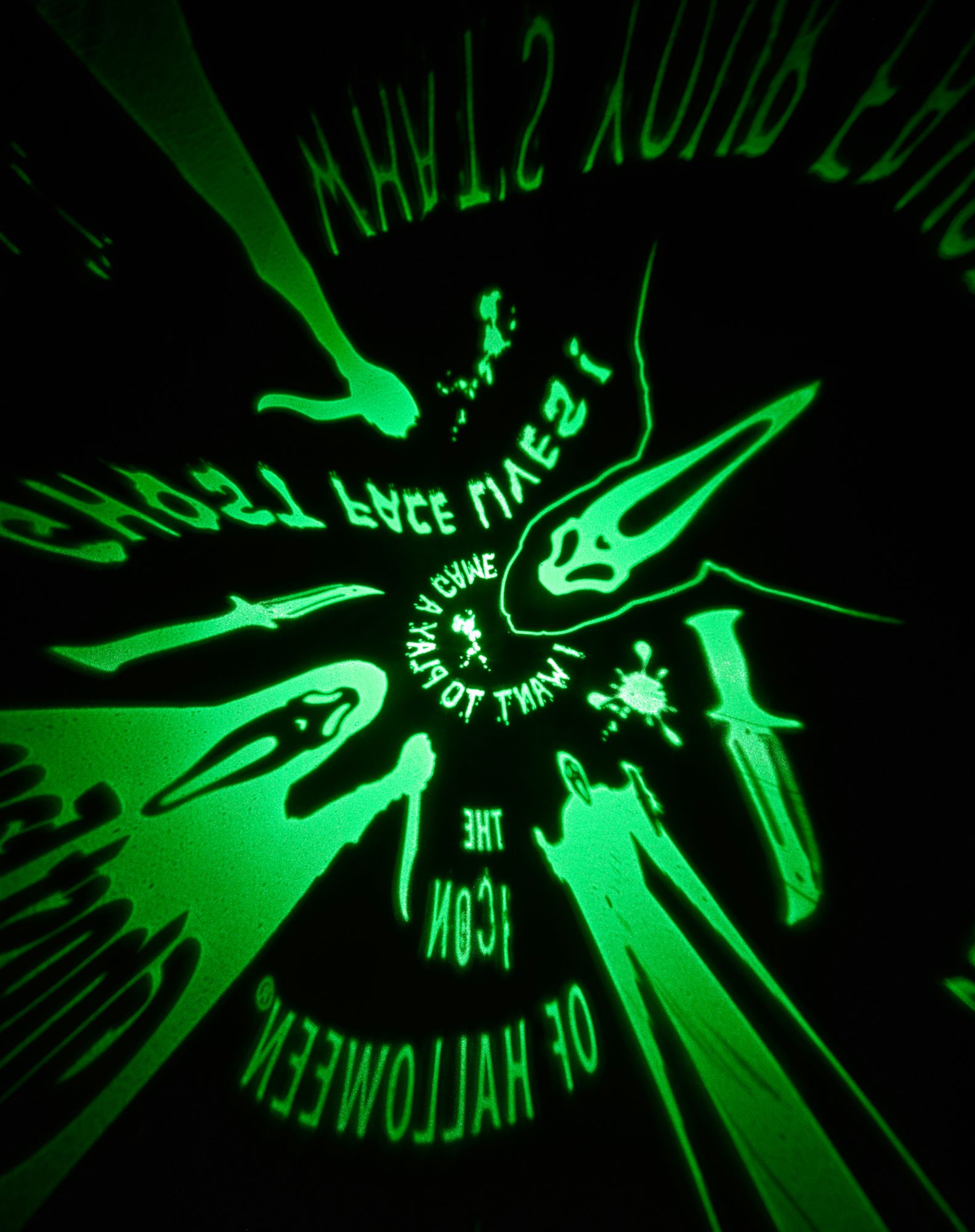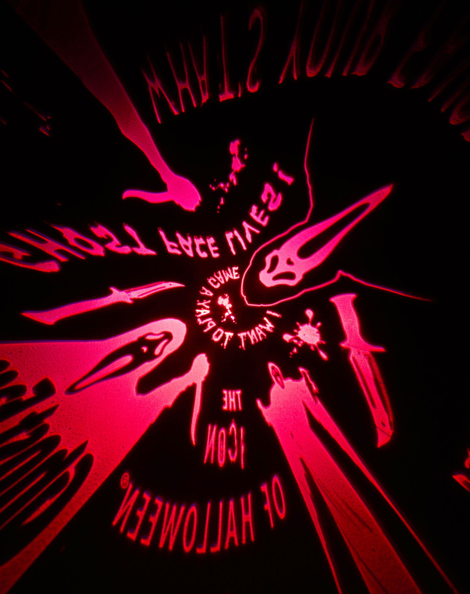 Let's make it a killer party! This Ghost Face® Tabletop Projector transforms your bare walls into a scene straight out of a slasher movie. Watch in awe as knives, chilling phrases, and Ghost Face's® silhouette dance around you in thrilling red, blue, and green tones.