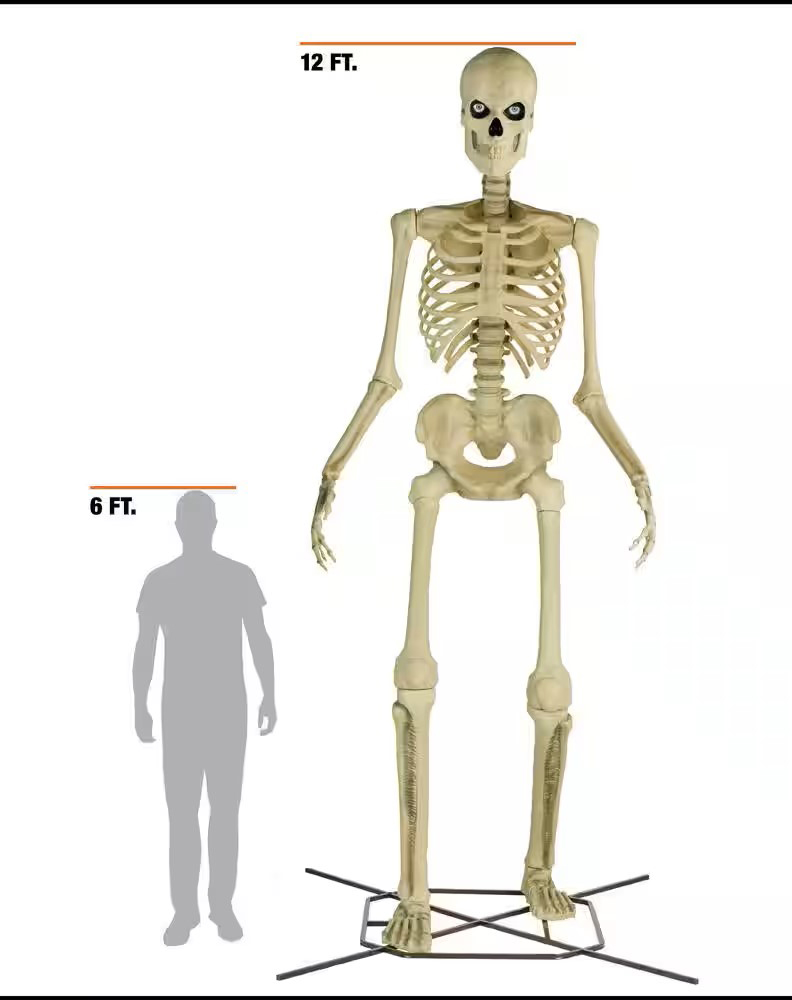 Go big on spookiness with this 12-ft. giant skeleton. You can spook people with the LCD eyes that seem to move and blink. Ground stakes keep it secure for a thrilling outdoor display. Comes with durable metal frame and ground stakes for stability. Timer function: 6-hours on/18-hours off.