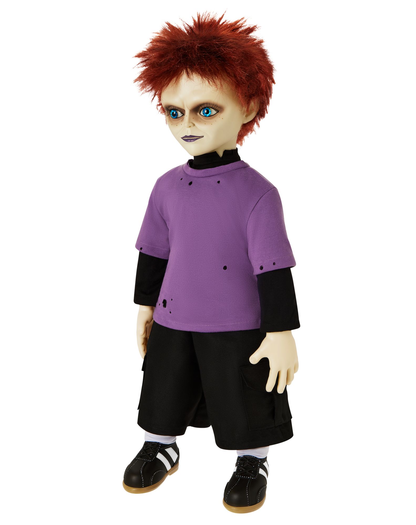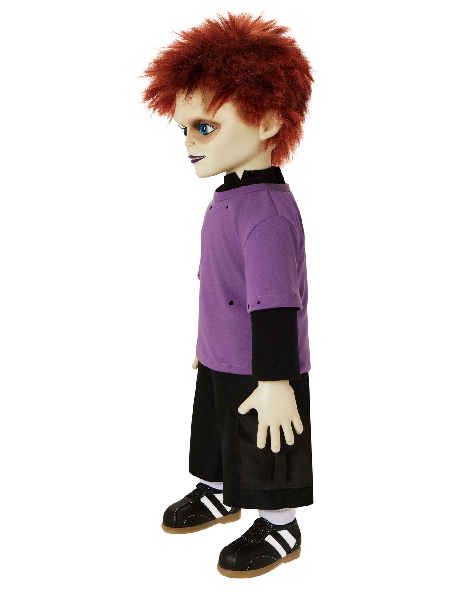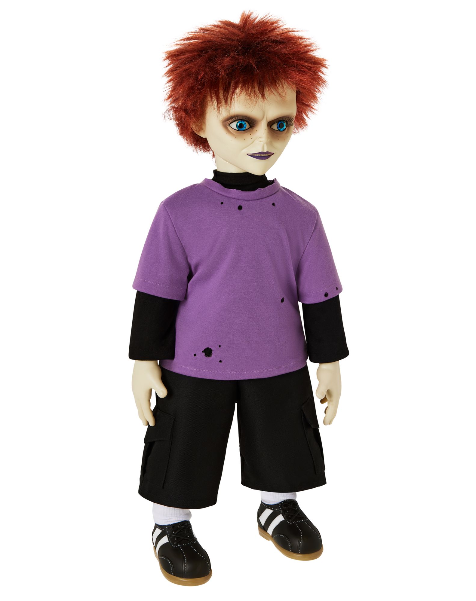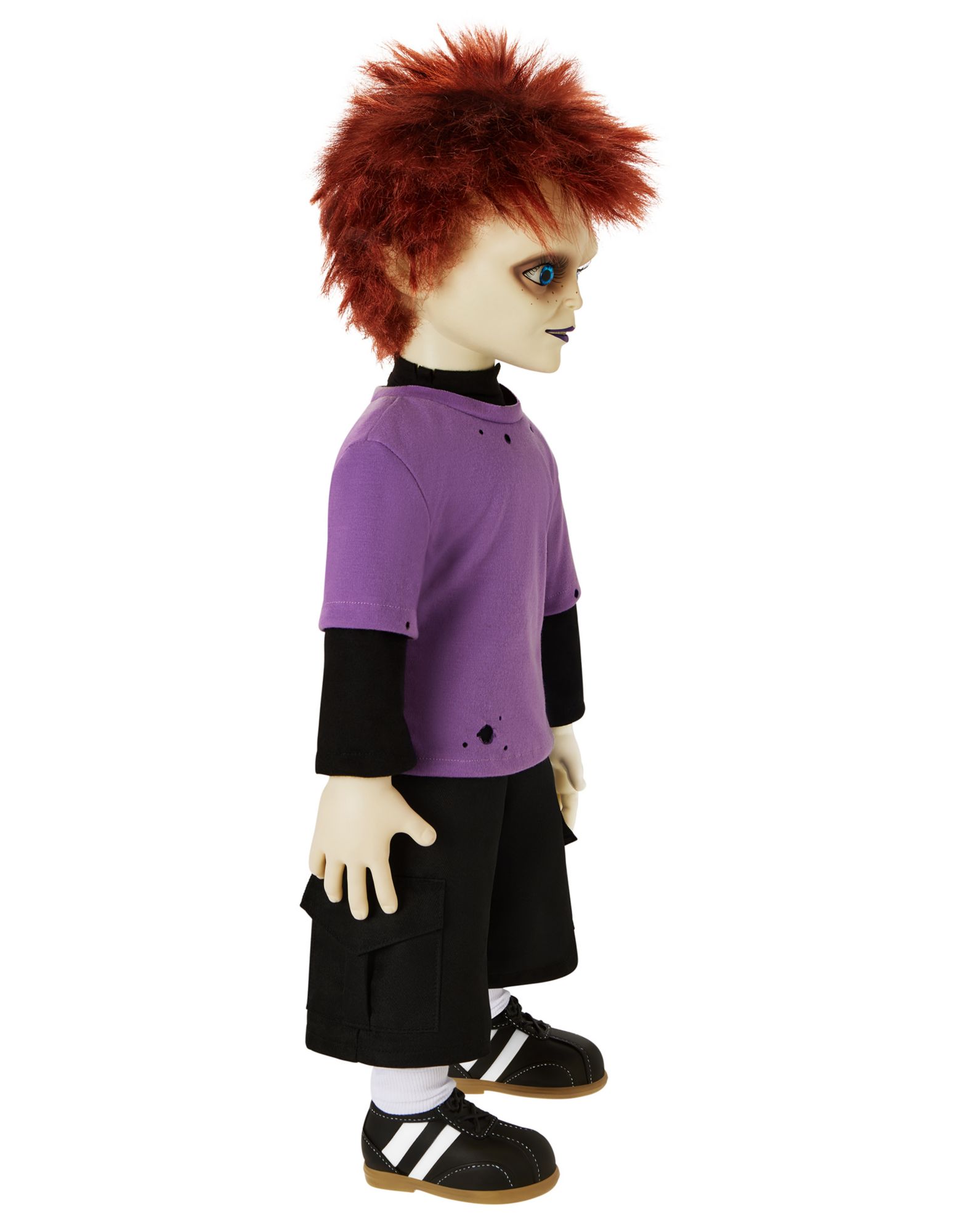Add the child of Chucky and Tiffany to your collection with this 24" tall Glen doll! Glen's uniquely menacing features and disheveled red hair leave no doubt that they are the child of cold-blooded killers. With a distressed purple t shirt, black shorts, and casual sneakers, this Glen doll looks just like the Seed of Chucky star. Glen comes packaged in their very own box making them the perfect collectible for any horror fanatic!