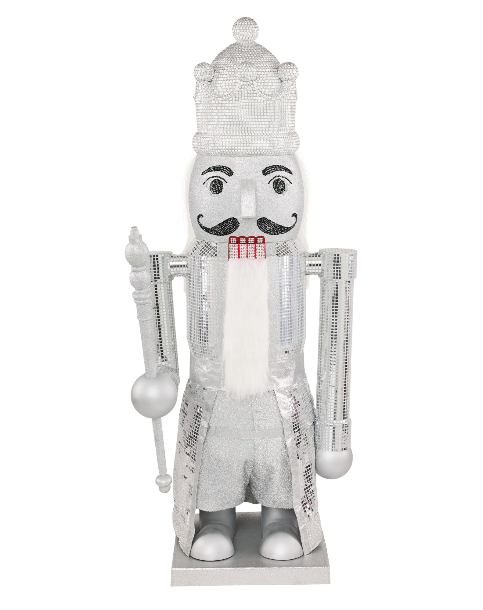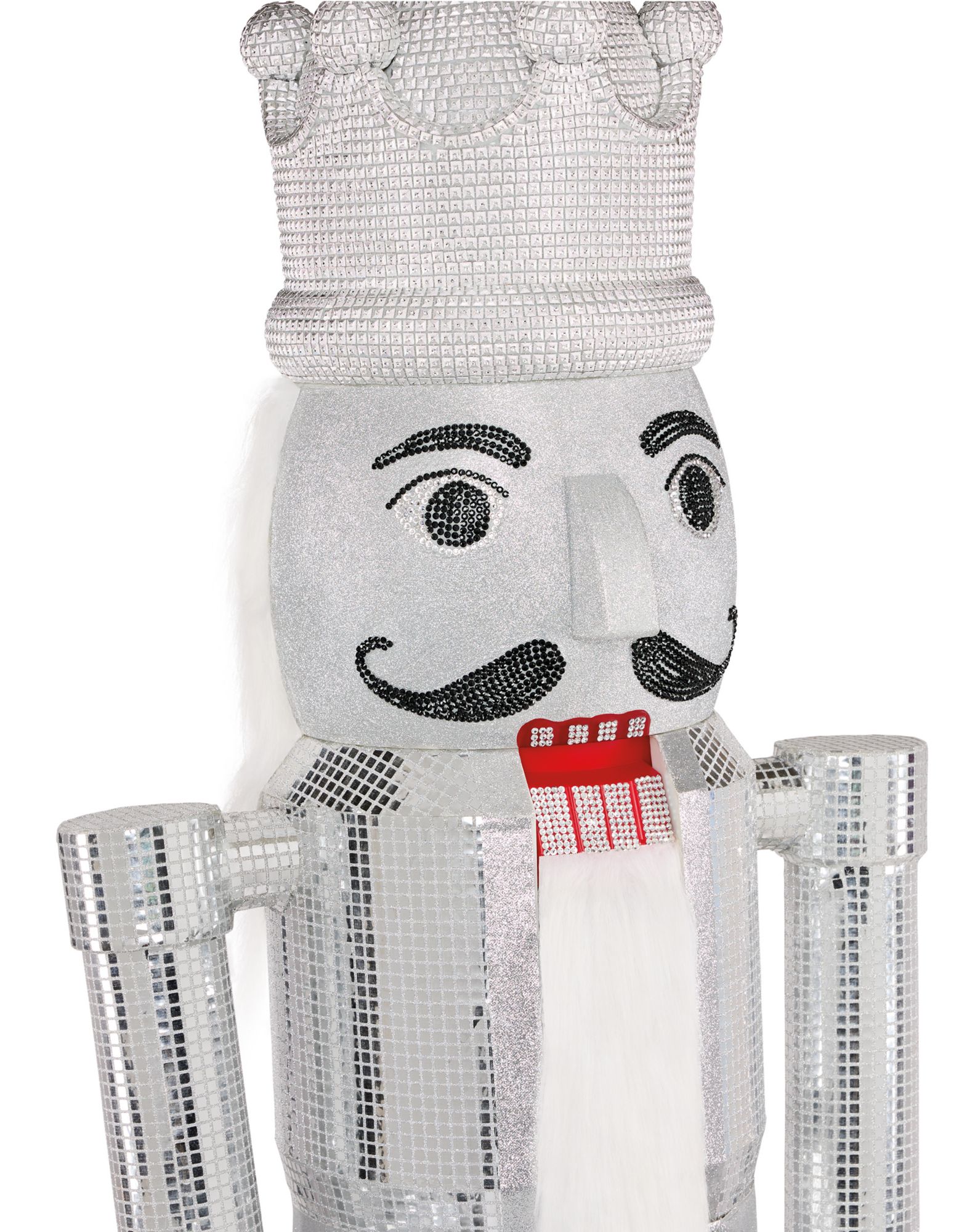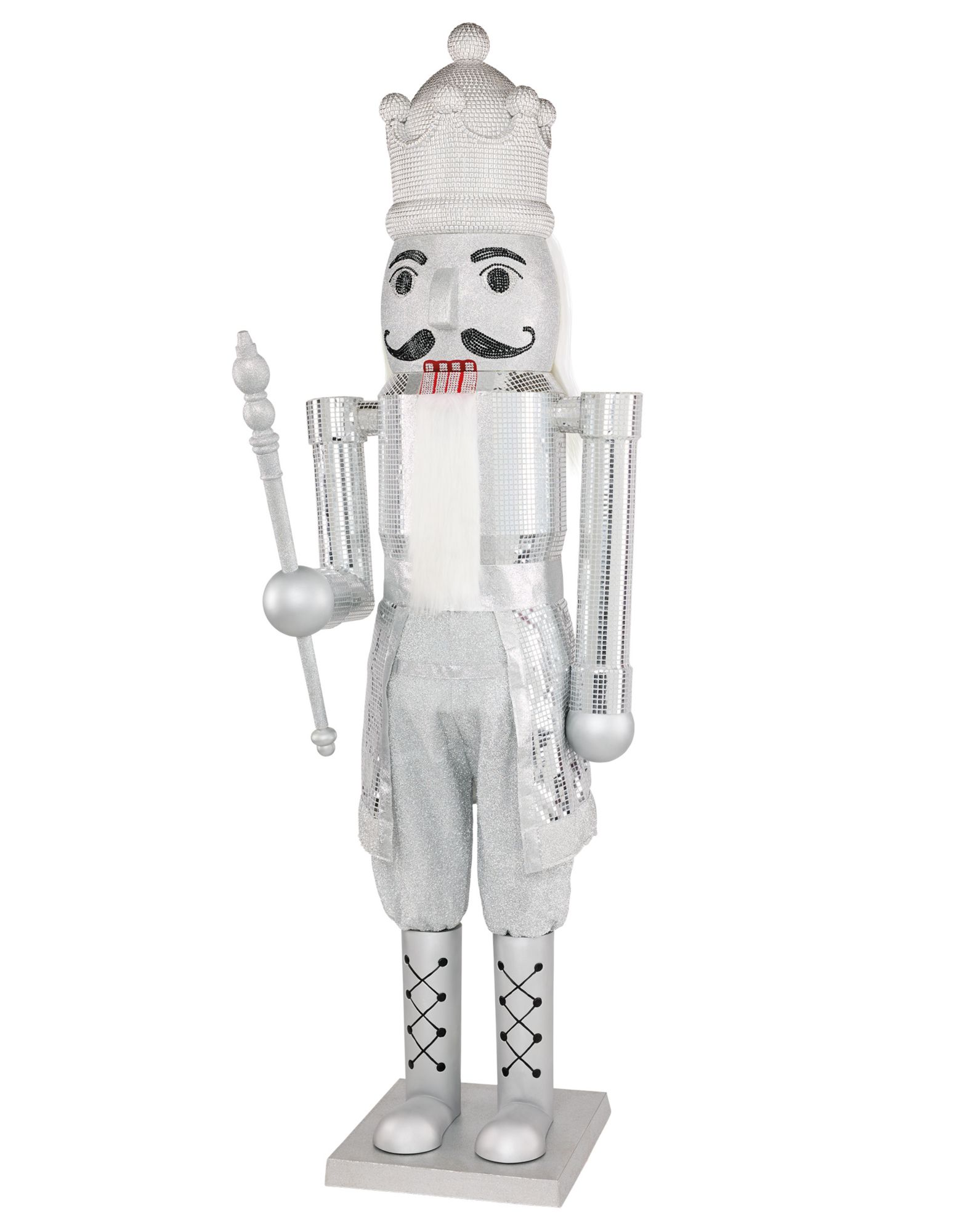 Bring holiday magic to your home with this life-sized Silver Bling Nutcracker Animatronic. Play your favorite sounds of the season with its Bluetooth audio compatibility that easily connects to your phone. This 7-foot-tall nutcracker animatronic is bedazzled with sparkling rhinestones and is dressed in a dazzling disco ball-inspired outfit.